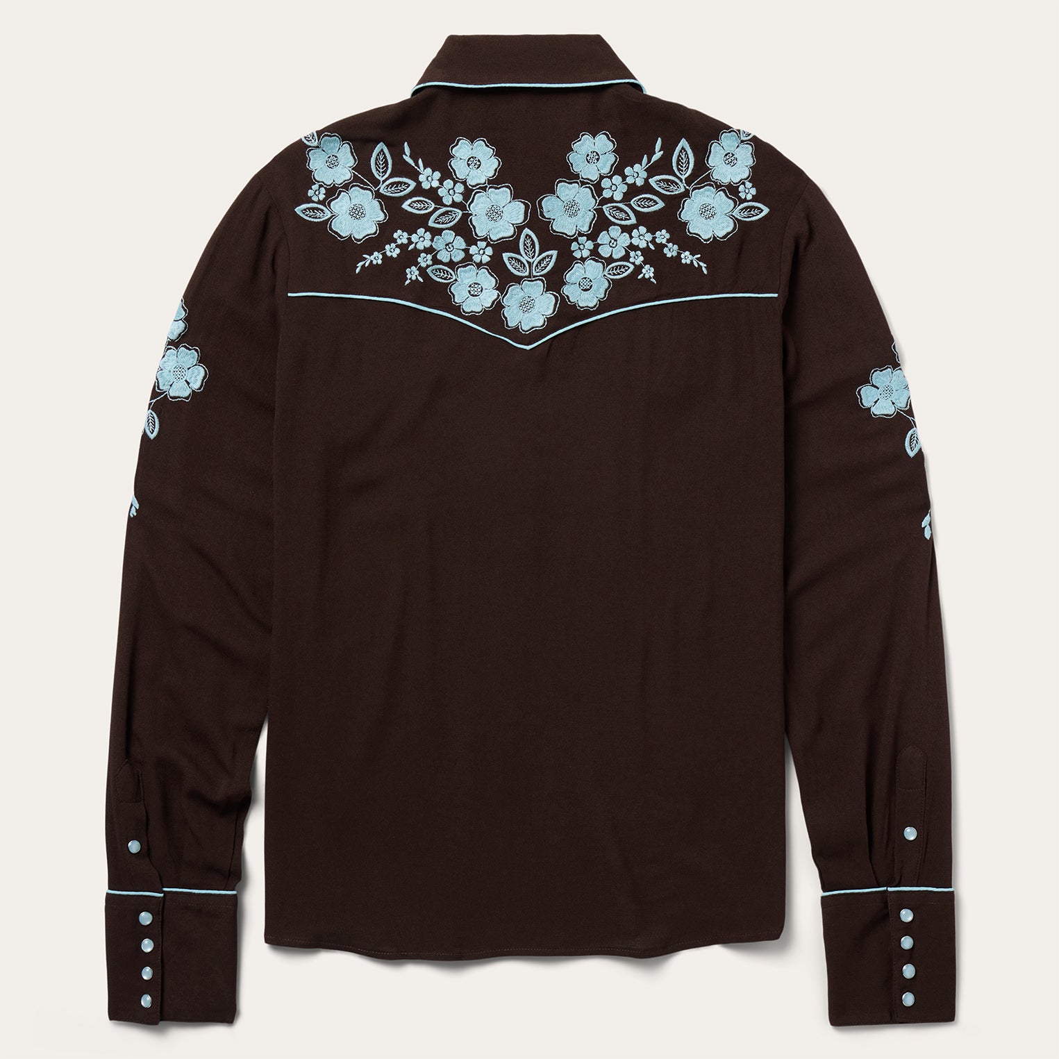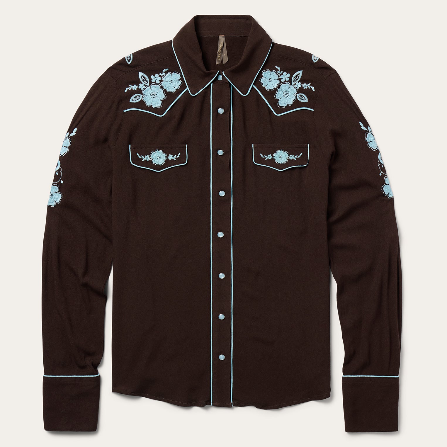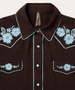 This western blouse is crafted from soft, silky 100% rayon crepe and features statement-making embroidery and retro-style contrast piping. It has single-point curved front and back yokes and front faux pocket flaps and is cut in our flattering boyfriend fit, which allows for all-day comfort and freedom of movement.