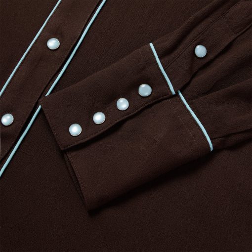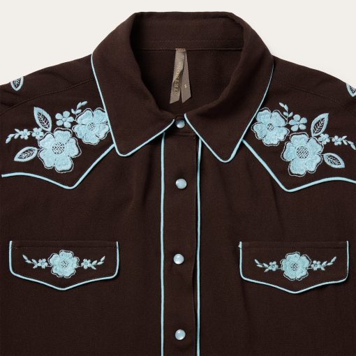 This western blouse is crafted from soft, silky 100% rayon crepe and features statement-making embroidery and retro-style contrast piping. It has single-point curved front and back yokes and front faux pocket flaps and is cut in our flattering boyfriend fit, which allows for all-day comfort and freedom of movement.