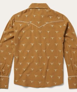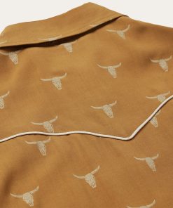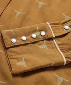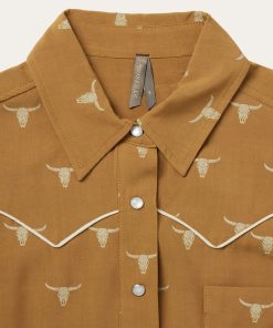 Fit for any cowgirl, this snap front blouse wears its Western influence proudly with an exclusive all-over Mojave steer head print and contrast cream-colored piping at the yokes and cuffs. Crafted of high-quality 100% flat rayon, it has a light, airy texture and a flattering fit that allows for freedom of movement. It features single point, deep curved front and back yokes and a single point left chest patch pocket.