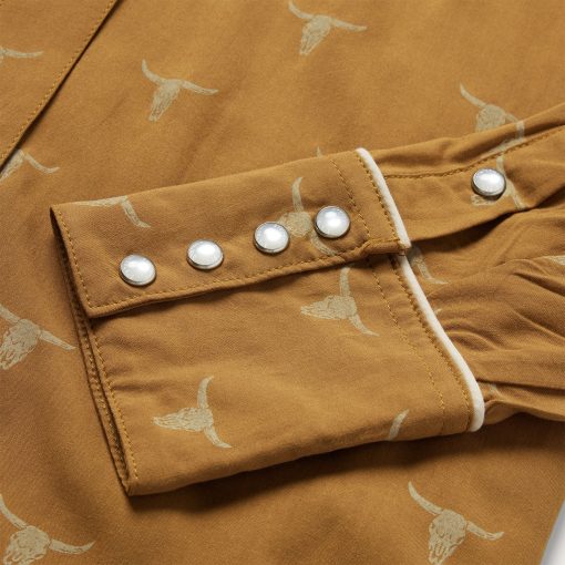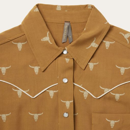 Fit for any cowgirl, this snap front blouse wears its Western influence proudly with an exclusive all-over Mojave steer head print and contrast cream-colored piping at the yokes and cuffs. Crafted of high-quality 100% flat rayon, it has a light, airy texture and a flattering fit that allows for freedom of movement. It features single point, deep curved front and back yokes and a single point left chest patch pocket.