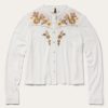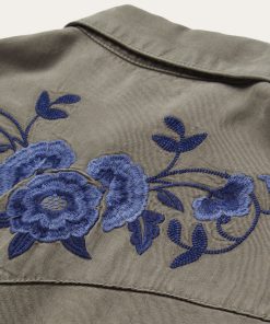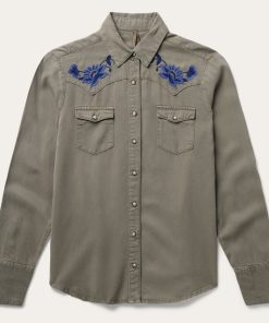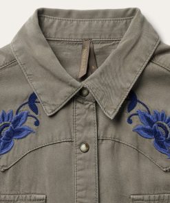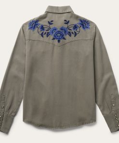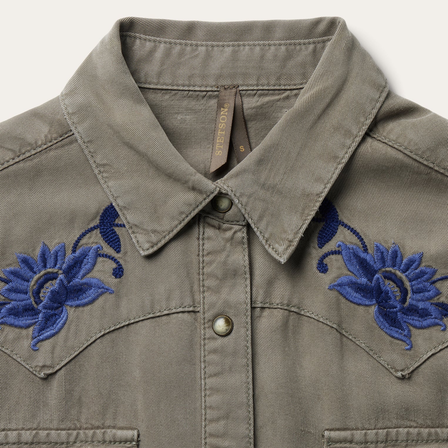 This Western-style boyfriend fit shirt is crafted from durable 100% lyocell denim twill that has been yarn dyed a rich olive tone. A stunning navy and cornflower embroidered floral detail is featured on the traditional Western-style single point curved front and back yokes. Faux pocket flaps, a classic snap front closure and self piping complete this unique, stylish top.