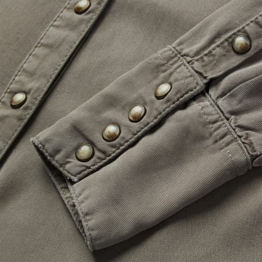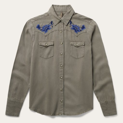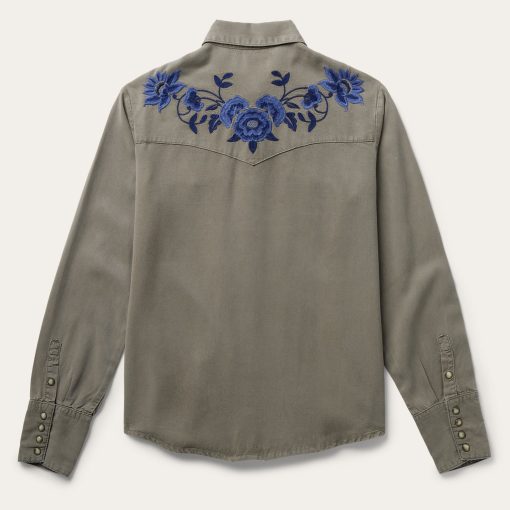 This Western-style boyfriend fit shirt is crafted from durable 100% lyocell denim twill that has been yarn dyed a rich olive tone. A stunning navy and cornflower embroidered floral detail is featured on the traditional Western-style single point curved front and back yokes. Faux pocket flaps, a classic snap front closure and self piping complete this unique, stylish top.
