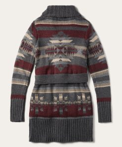 Featuring a deep wine and grey Aztec inspired pattern, this belted shawl collar cardigan sweater features drop shoulders, side seam pockets, button-front closure and a self tie waist. Made from a cozy wool blend, it has a flowing, easy drape that pairs perfectly over your favorite jeans.