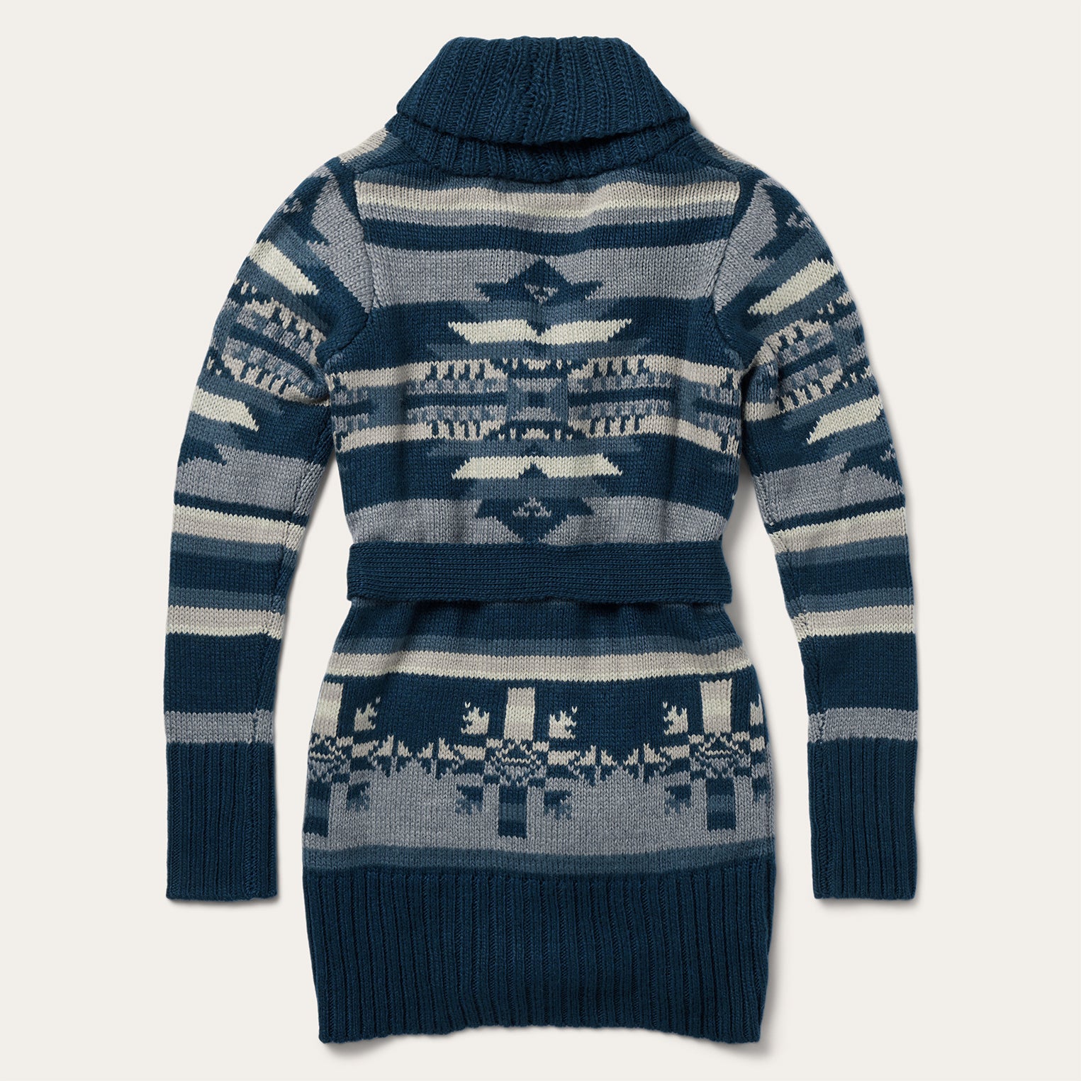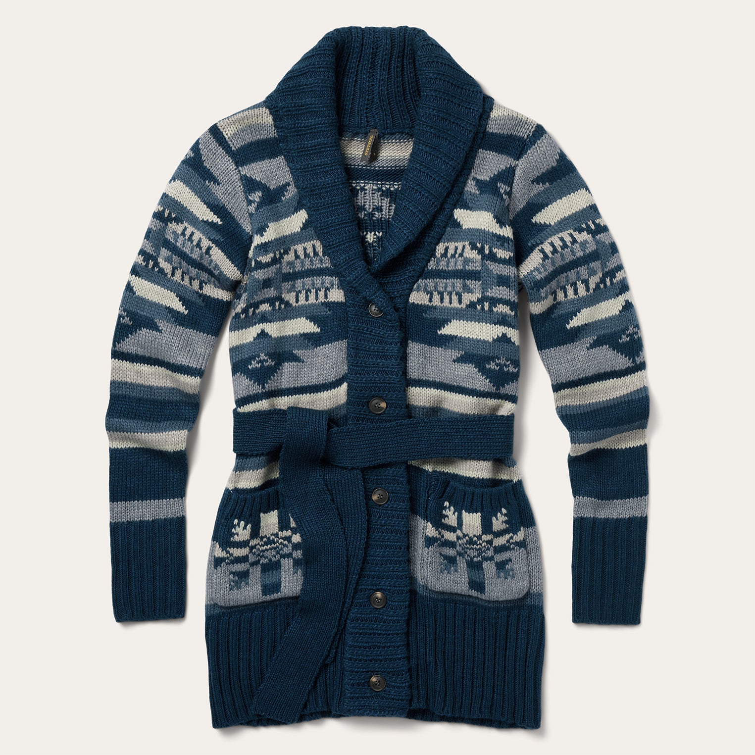 This stunning southwest-inspired belted cardigan sweater is made from a soft and comfortable acrylic/wool blend that has been yarn-dyed for rich, lasting color. It features an indigo aztec print design, a ribbed shawl collar and turned up cuffs and hem. Functional patch pockets keep essentials close and a 5-button front with self-belt keeps it all tied together.