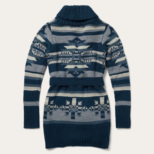 This stunning southwest-inspired belted cardigan sweater is made from a soft and comfortable acrylic/wool blend that has been yarn-dyed for rich, lasting color. It features an indigo aztec print design, a ribbed shawl collar and turned up cuffs and hem. Functional patch pockets keep essentials close and a 5-button front with self-belt keeps it all tied together.