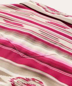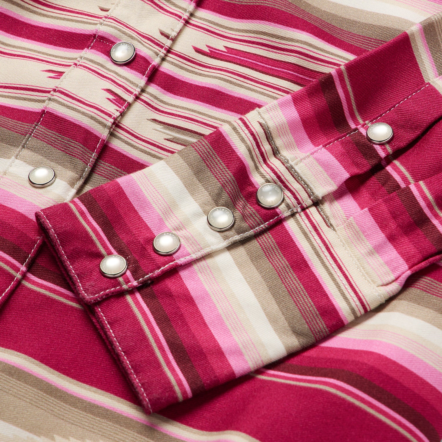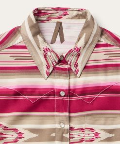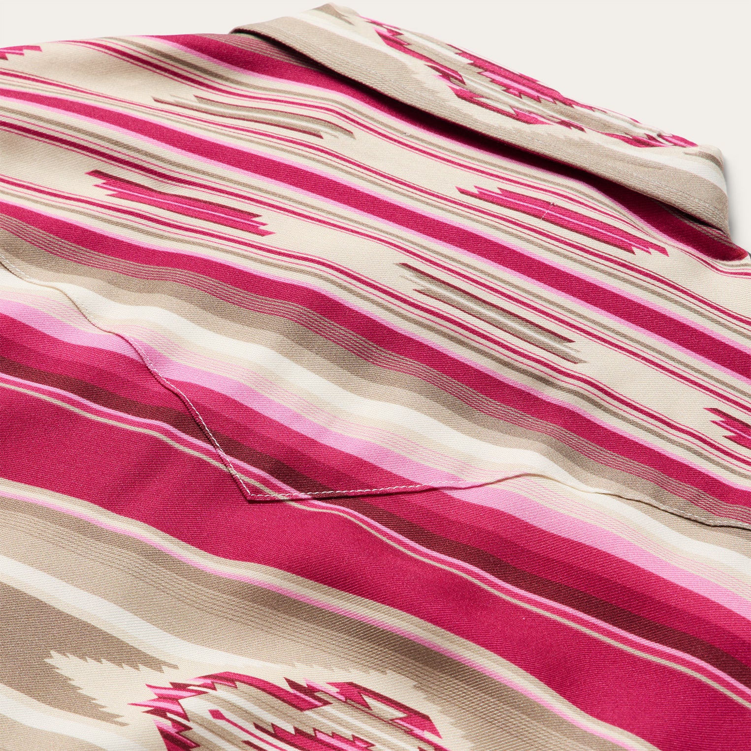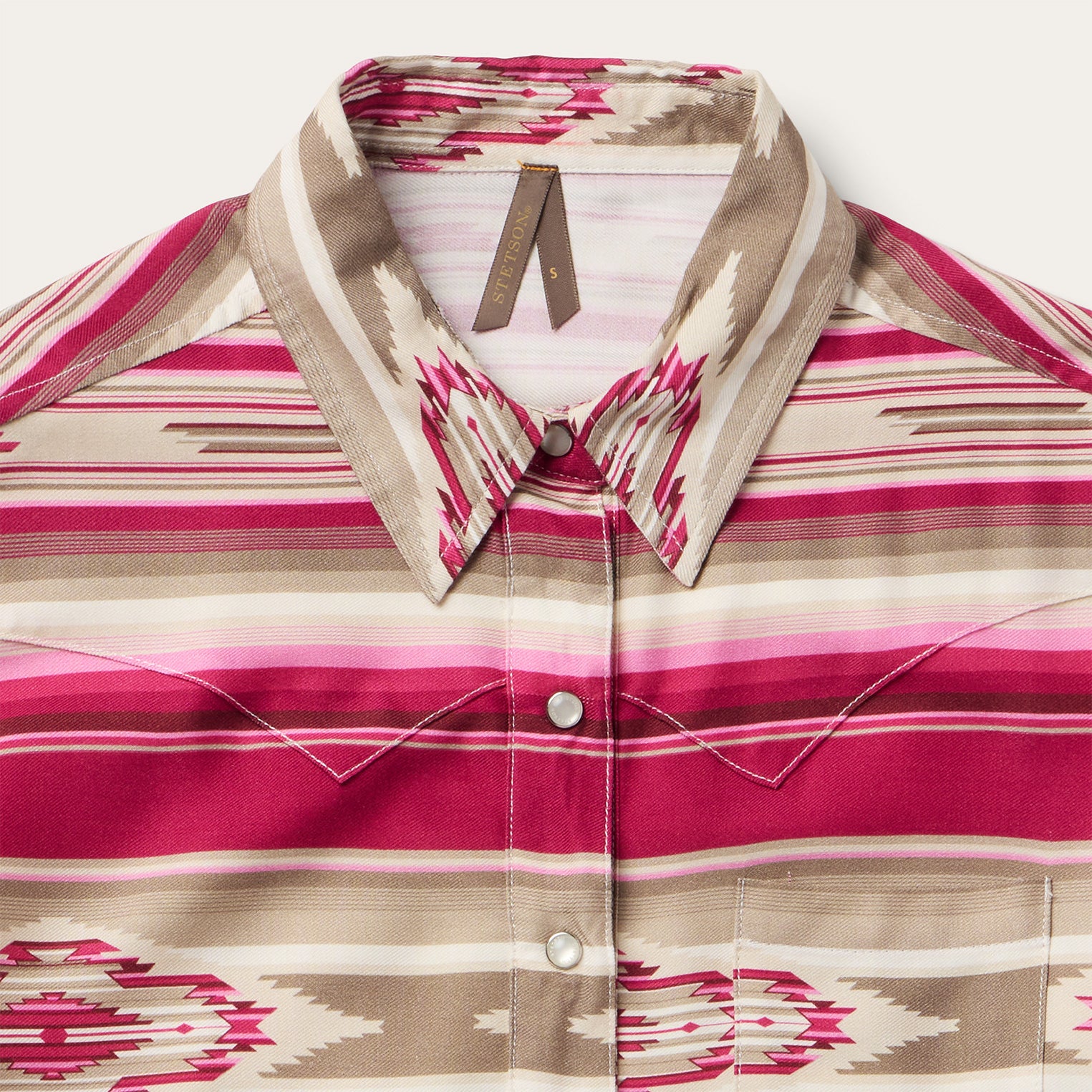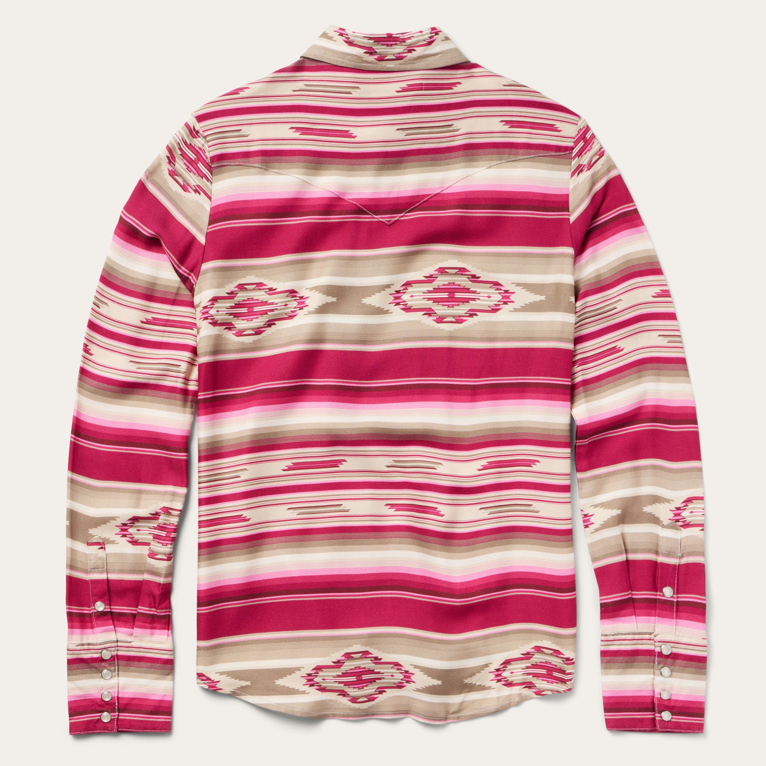 This western shirt is crafted from 100% rayon, which has a smooth, silky feel and features our vibrant Scarlet Serape print. It has single point deep curved front and back yokes, a single point left chest patch pocket, a full snap front and five snap cuffs. Cut with an easy, flattering drape, the dress allows for all-day comfort and freedom of movement.