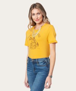 Nothing says good times like the relaxed feel of a graphic tee. Designed for maximum comfort without sacrificing an ounce of style, our t-shirts are made from airy cotton and screen-printed with custom signature graphics. This Western Stetson tee has been gently distressed, providing the perfect worn-in look for the spirited cowgirl. Go casual with a pair of jeans and boots, or dress things up with a skirt and sandals — however you decide to wear it, this shirt will see you through your day and then some. Extra soft and cut with the perfect slim fit, it’s an instant classic.