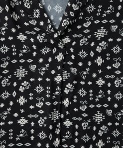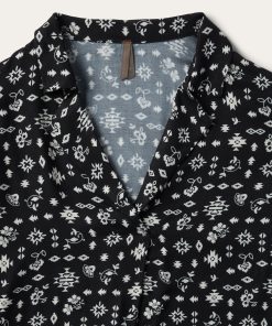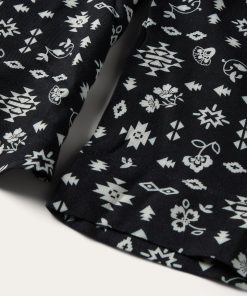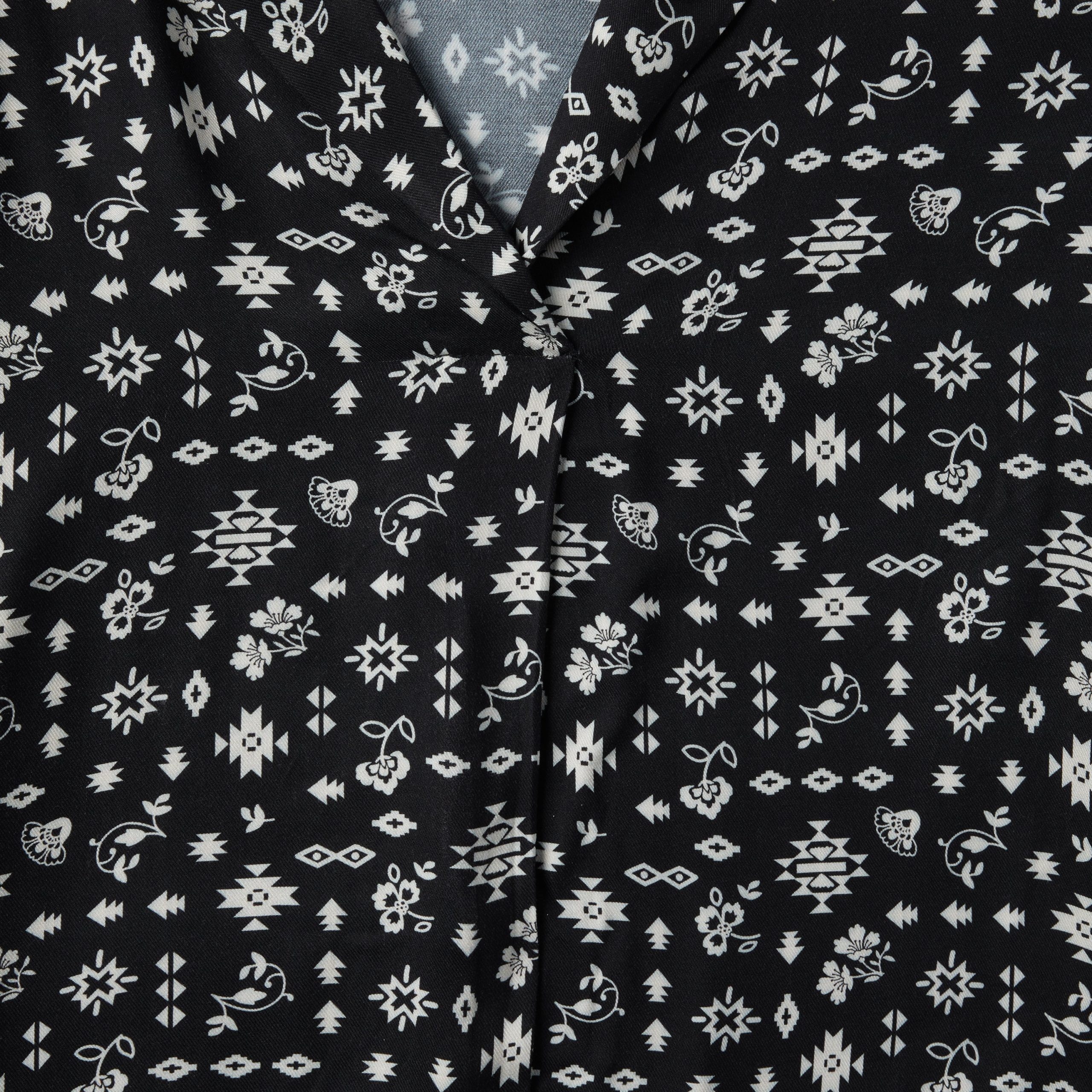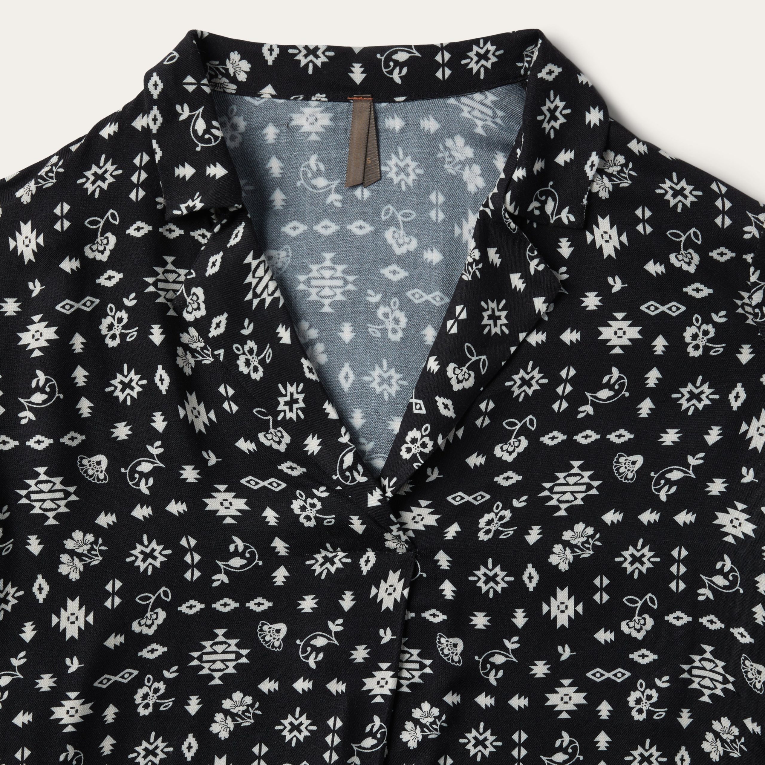 This pullover blouse is crafted from 100% rayon twill and features an allover Southwestern Ditzy print. It has an open notch collar with a V-neckline, long sleeves with a slight bell and a large pleat at the center front.