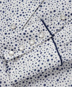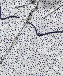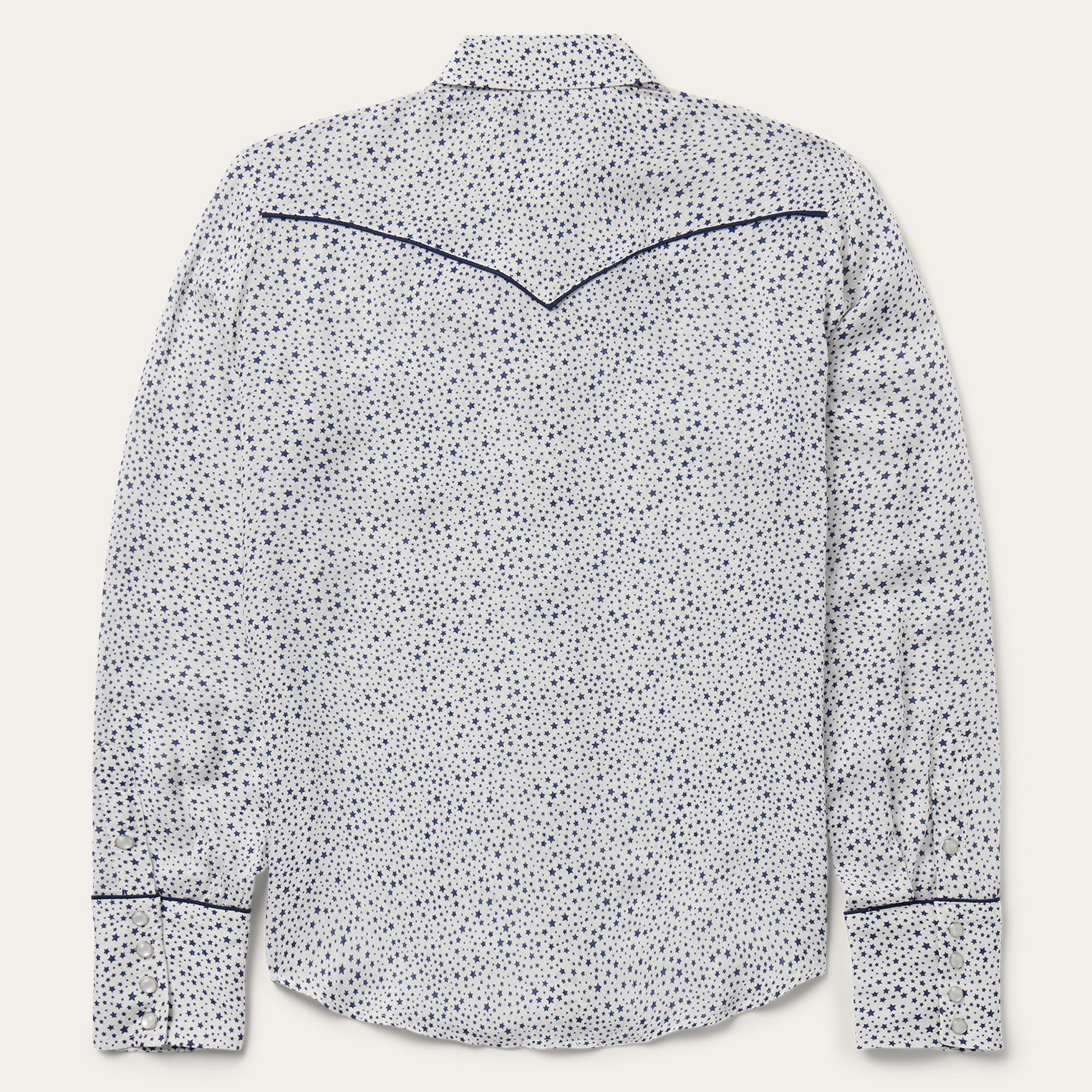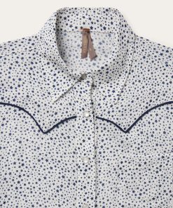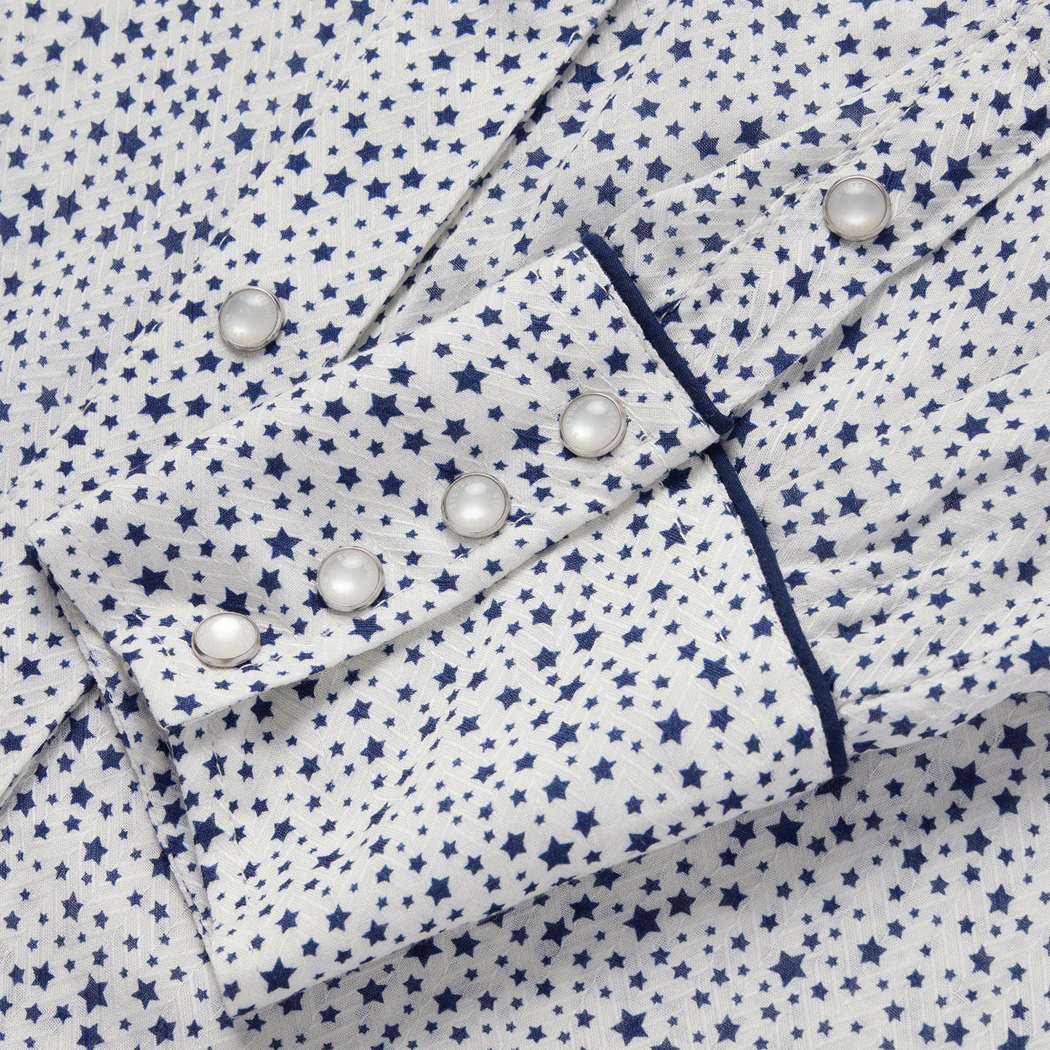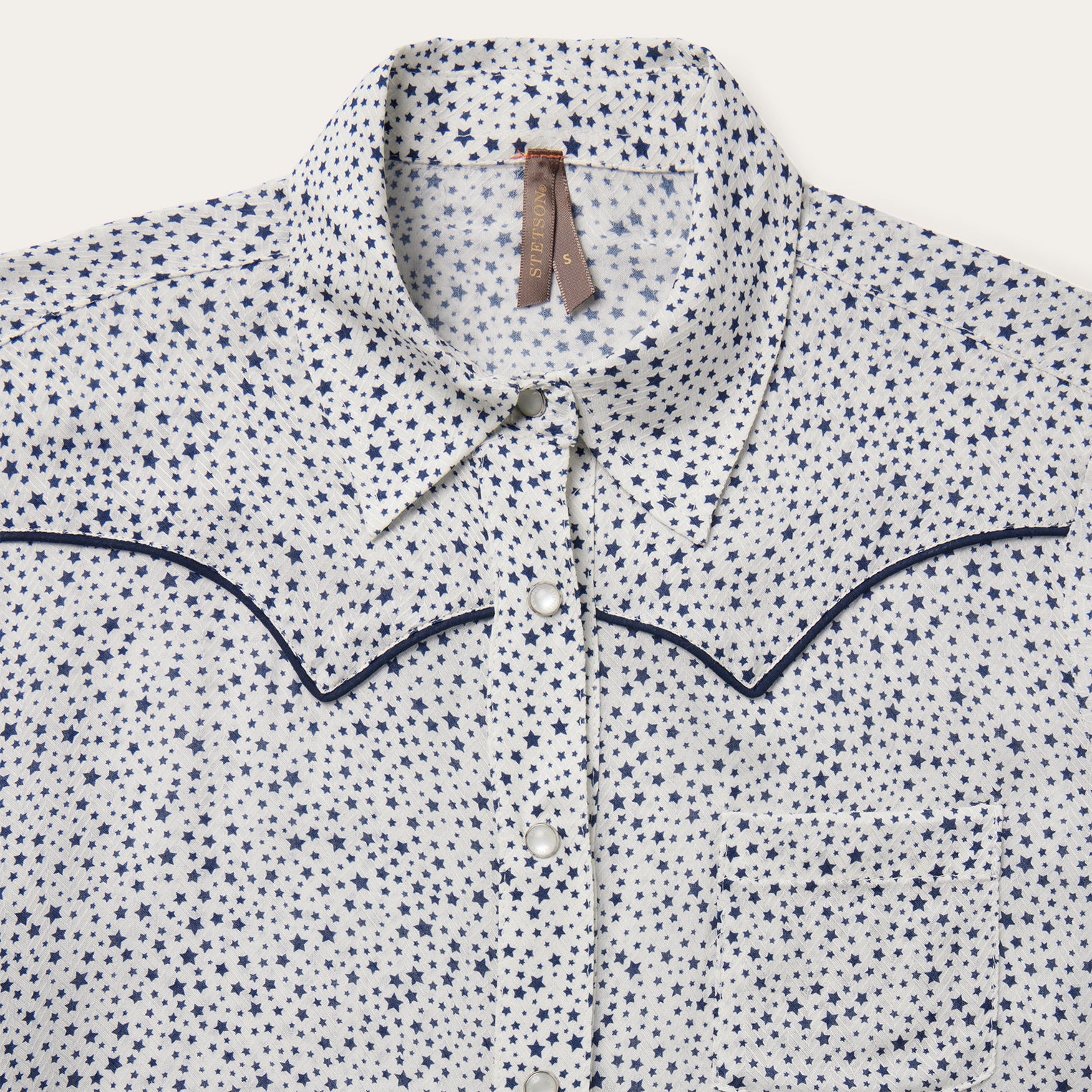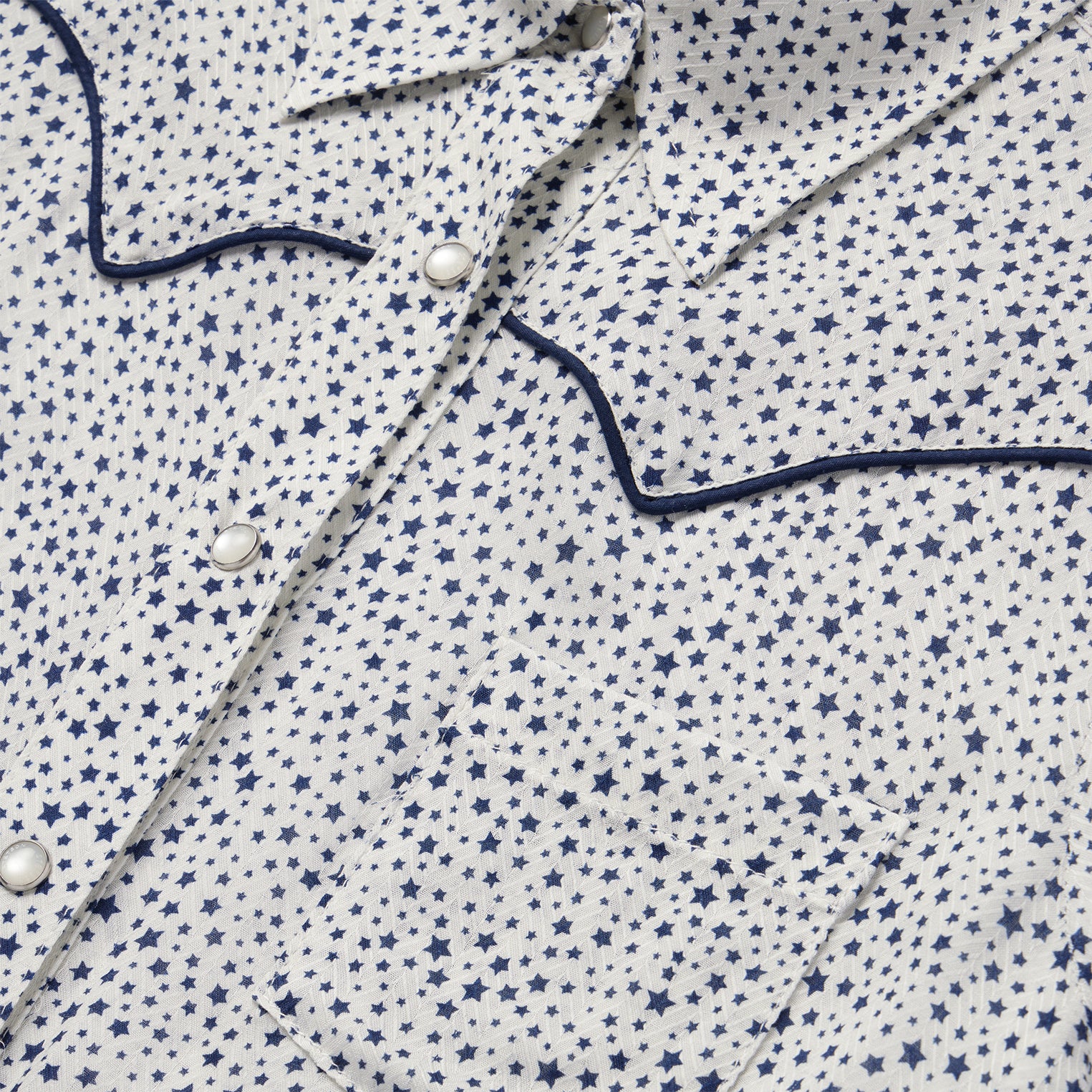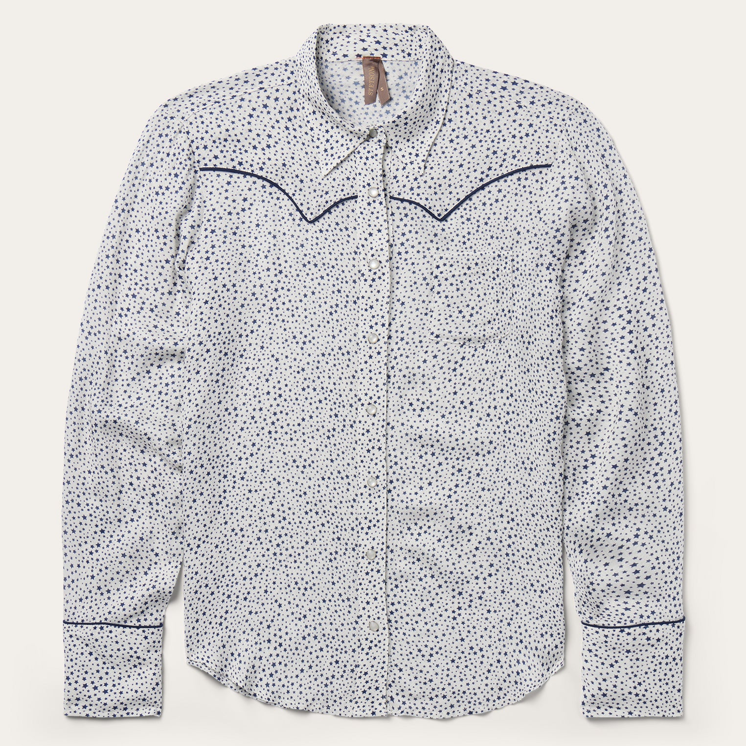 This stylish western-inspired shirt is crafted from soft 100% rayon and features our exclusive Stars Print. It has single point deep curved front and back yokes and a single point patch pocket, along with a full snap front. Cut with an easy, flattering drape, the blouse allows for all-day comfort and freedom of movement.