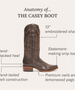 The Casey Boot features a leather vamp and 13” leather shaft with an eye-catching embroidered design. It has a snip toe—the ultimate statement-making style. Its quality construction includes single welt leather soles with brass nails and lemonwood pegs, hand-stacked leather heel, premium leather lining and a cushioned leather insole that ensures comfort and support in every step.