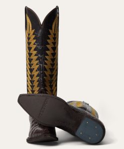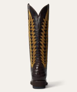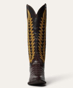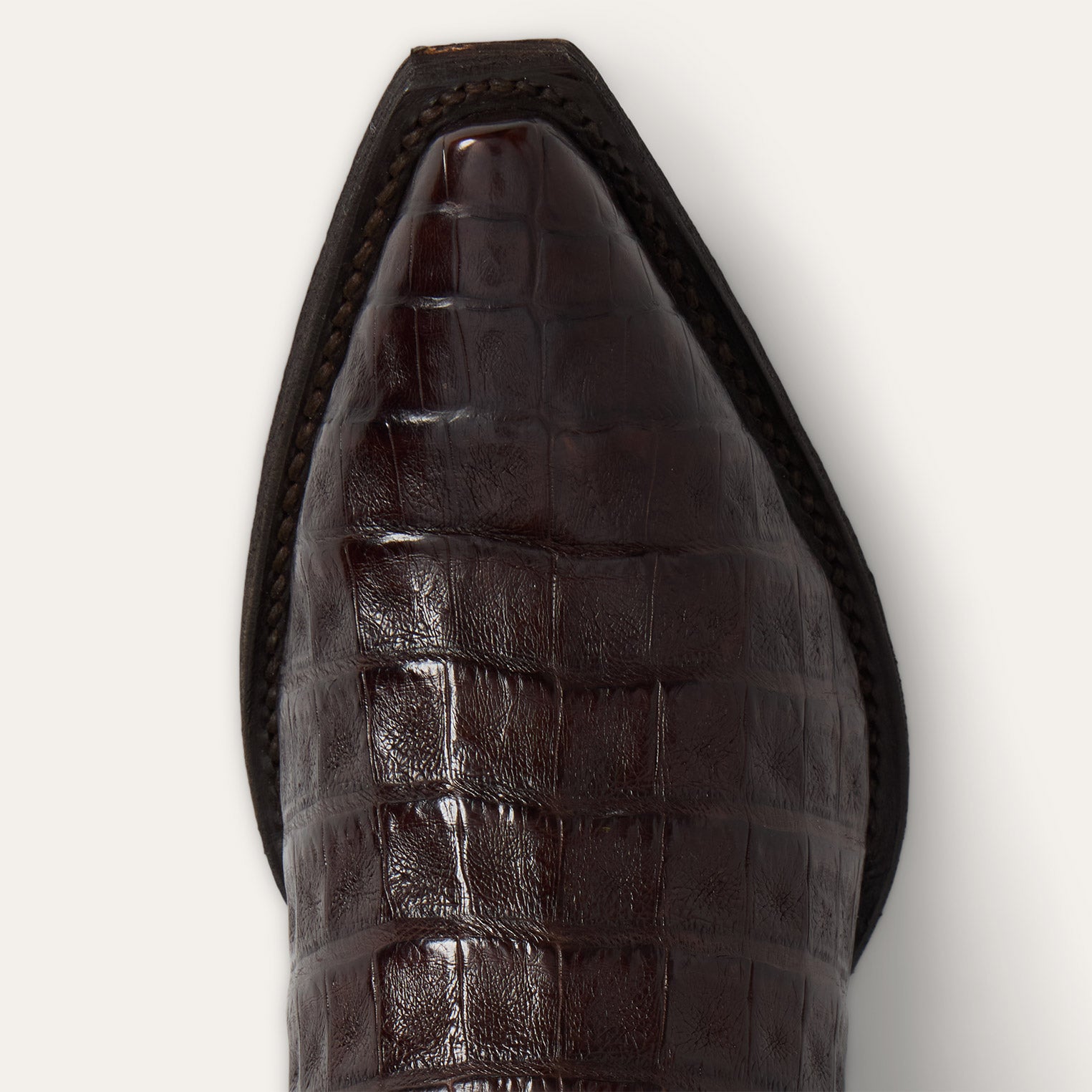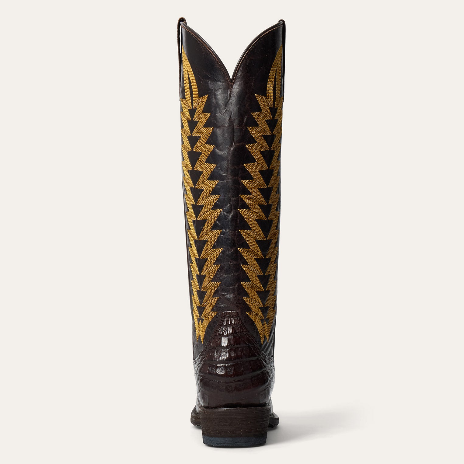 A bold western silhouette with elevated edge, the Kenzie Boot features a full caiman vamp—prized for its distinctive texture and natural variation—paired with a 15” goat leather shaft embroidered with a vintage-inspired flame stitch. It’s finished with a stylish snip toe and a hand-stacked leather heel for a flattering lift. An all-leather sole, crafted with lemonwood pegs and brass nails, provides a firm foundation, while premium cowhide leather lining ensures lasting comfort with every step.